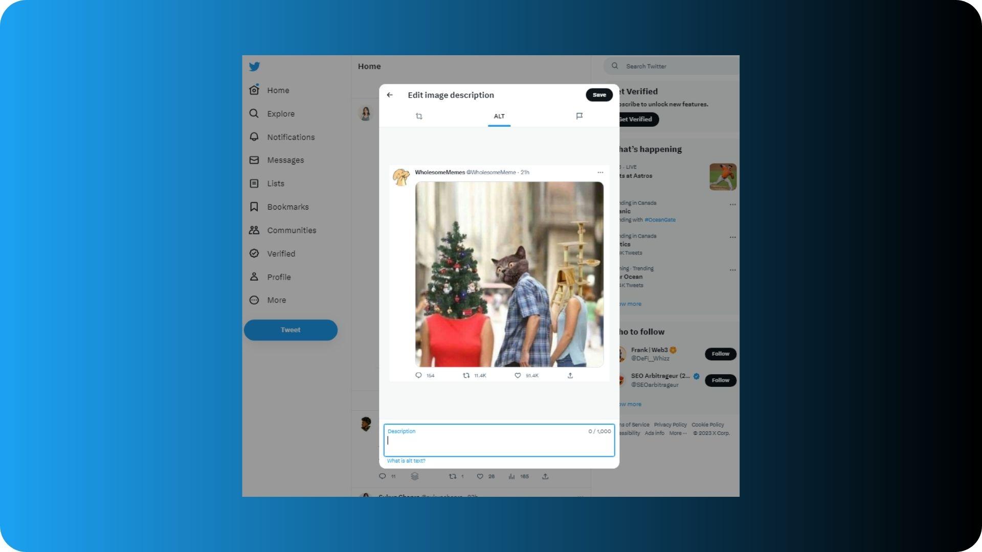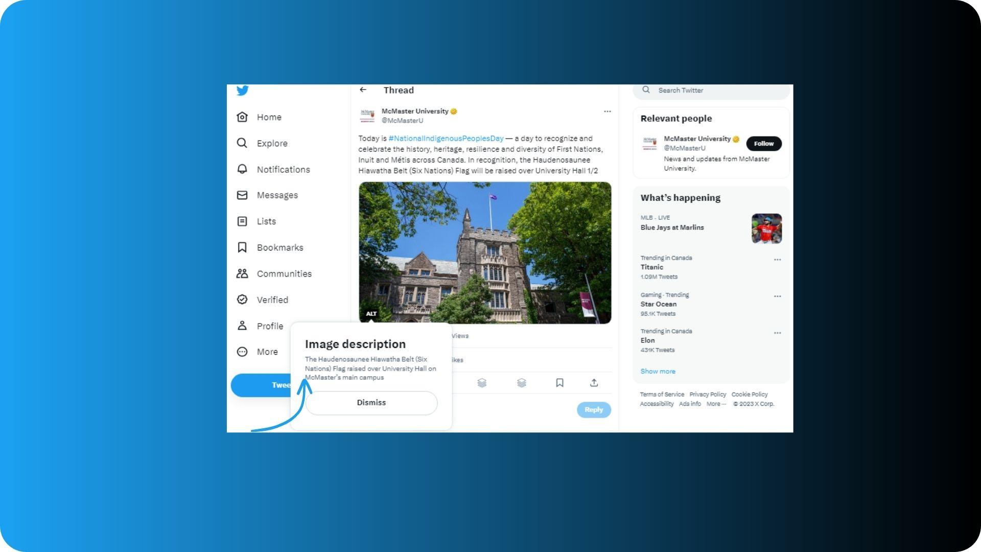 Use alt text or image description to describe images in your tweets. Ideally, the alt text should be descriptive but short. The image description should also explain the object of the image, tell what’s happening, and provide some context.