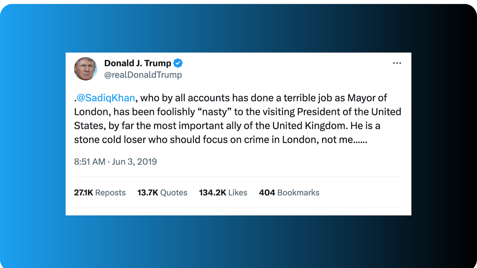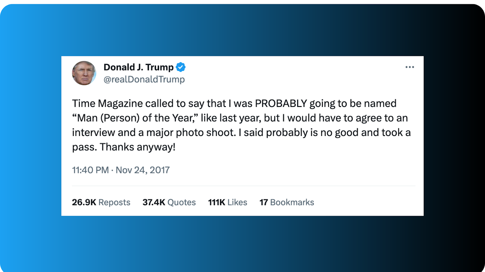 Trump, “Commander in Tweets”, has been on Twitter for more than a decade and, although controversial, has hacked how to grow viral on Twitter and has become one of the most influential persons on the Twitter/X platform.