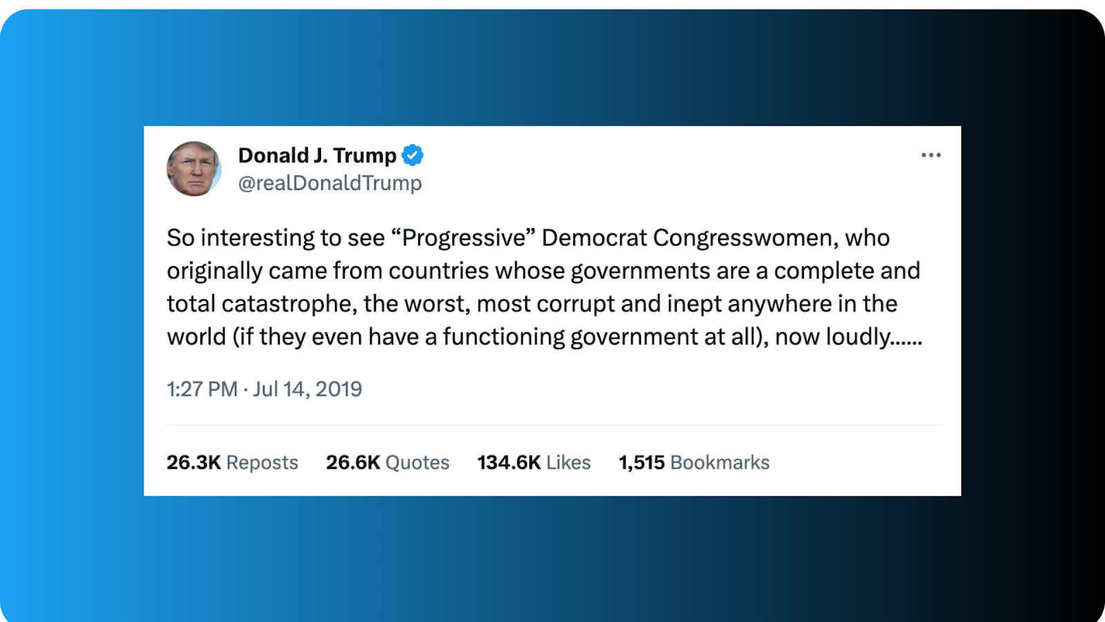 19- In a Twitter thread, Trump told congresswomen who were not white - Alexandria Ocasio-Cortez, Rashida Tlaib, Ayanna Pressley, and Ilhan Omar (who came to the US as a refugee when she was 12) - to leave the US and "go home."
