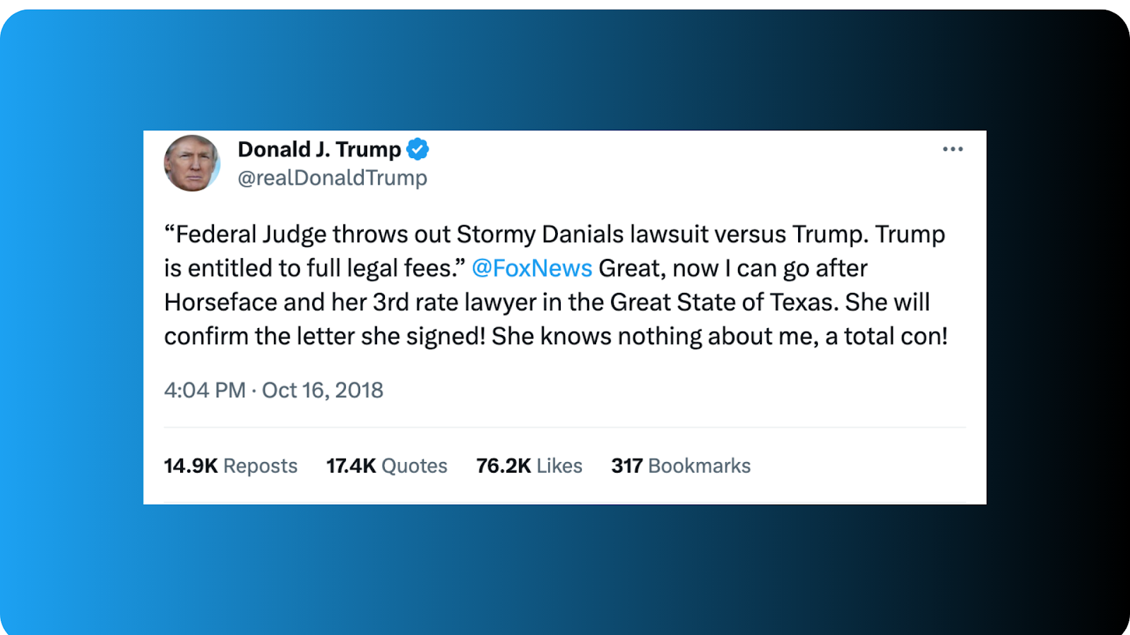 29- He called Stormy Daniels a "horseface" and a "total con" over claims she had an affair with him.