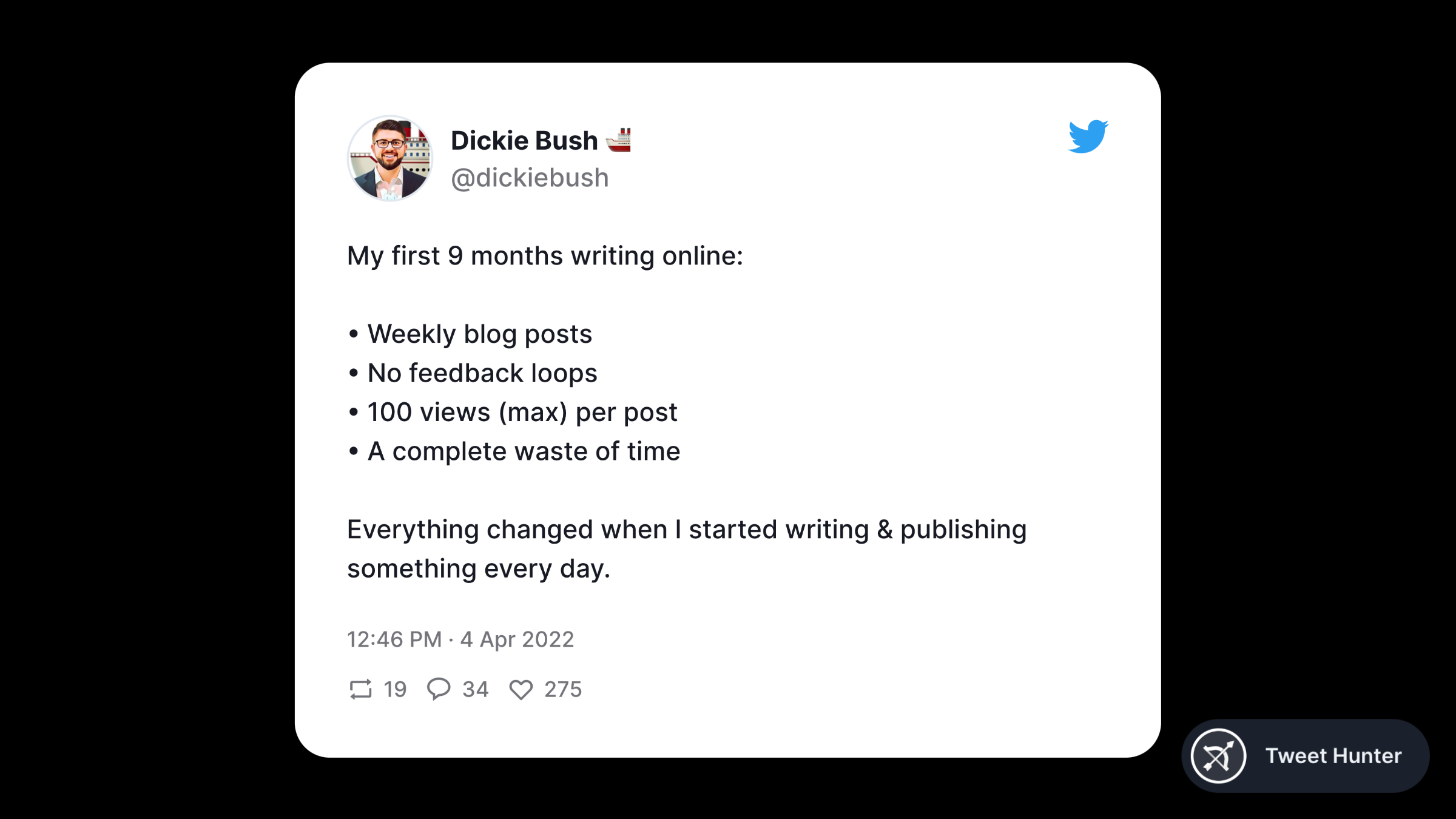 Each of these tweets shares one core insight (steps to success, tool stack, and journey to writing well).