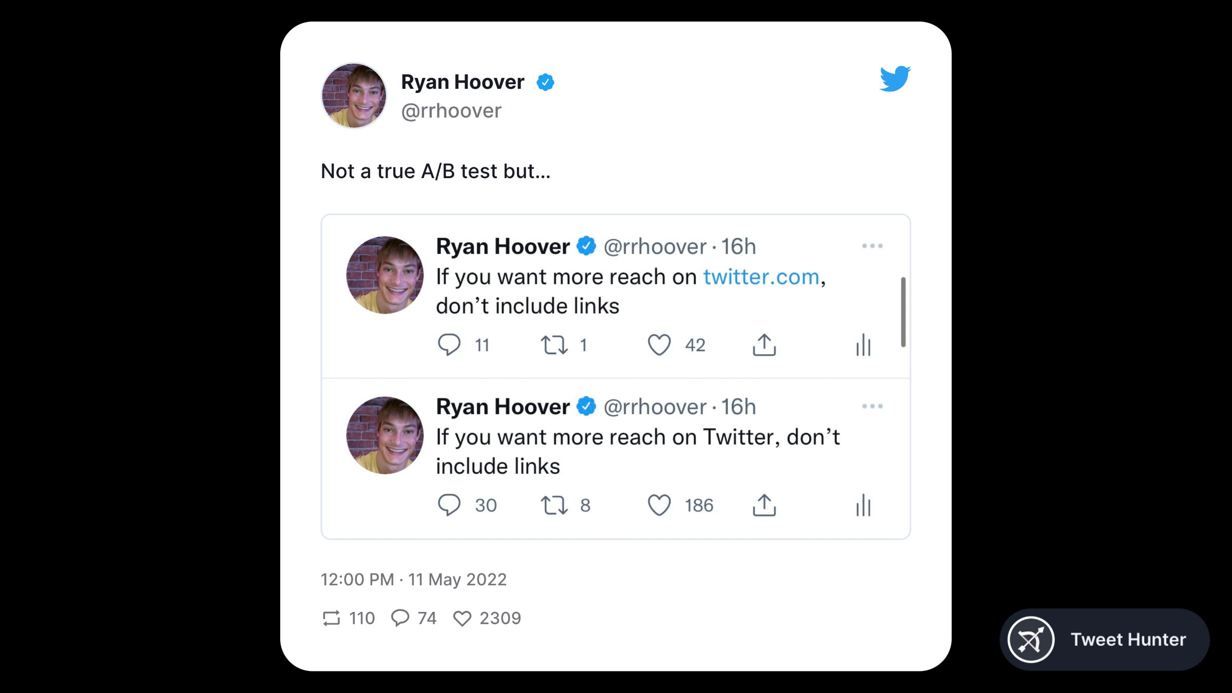 From experience, we can 100% ensure you that adding links to your tweets impacts reach in a negative way. Tests like the one Ryan did only reaffirm this.