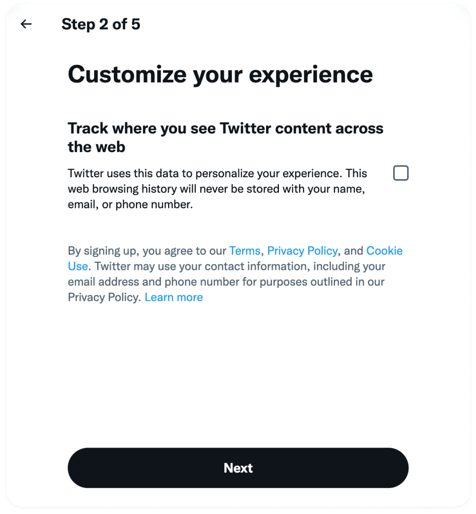 - After clicking on the “Next” button, Twitter will ask you to customize your experience. Right now, setting up any of the three options is unnecessary, so you can automatically hit “Next”.