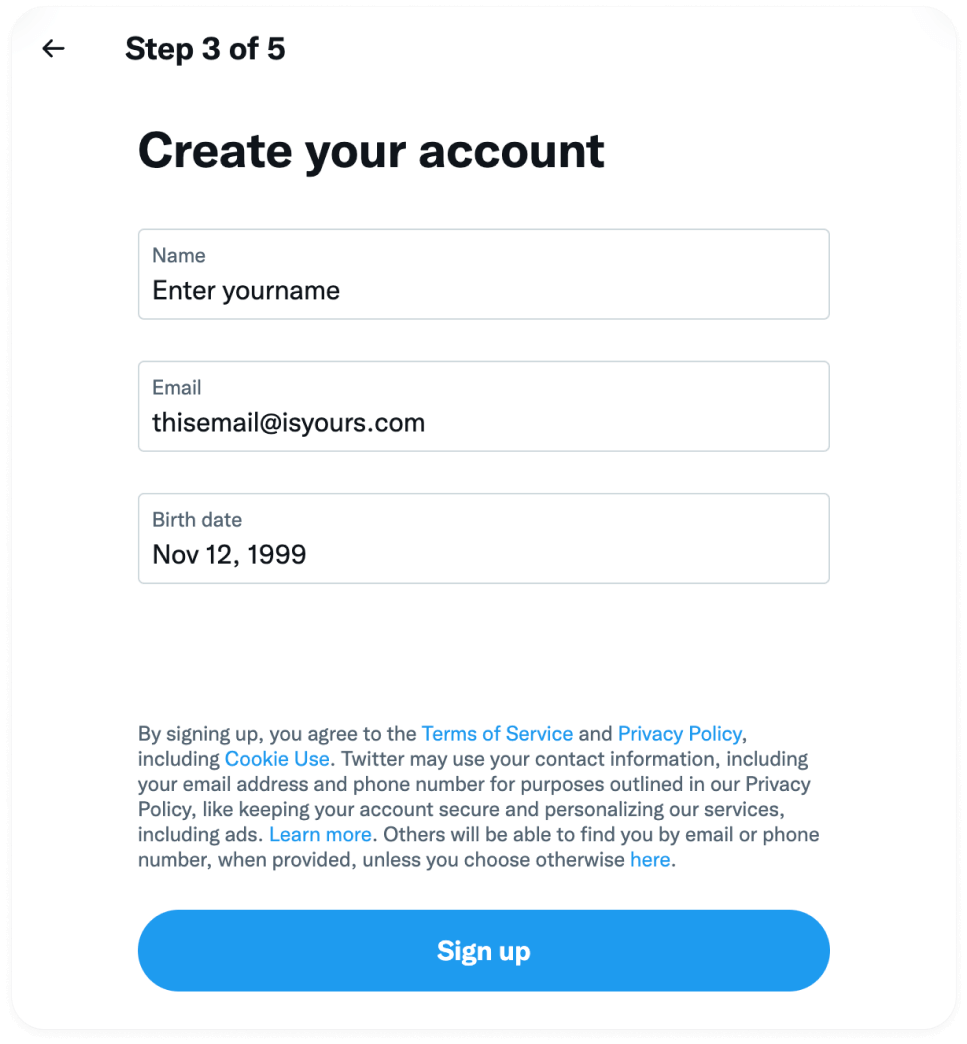 - Now, it’s time to sign up: Use your business email or phone number. It’s important to use your real name and email/phone number. Make sure you have an email for your business, if you already have a personal Twitter account you cannot use the same email for both accounts. You’ll need to complete your name and birth date.